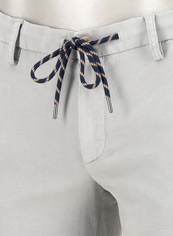 Hose mit Elastikbund an der Hinterhose, Tunelzug mit Kontrastkordel kann innenn und außen gebunden werden, seitliche Einschubtaschen, geknöpfte Gesäßtaschen