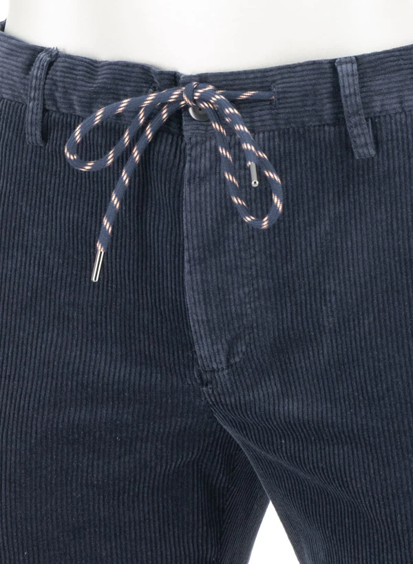 Die tiefe Navy-Färbung des mittelbreiten Cords verleiht dieser Hose zeitlose Eleganz mit dezentem Texturspiel. Das weiche Baumwoll-Lyocell-Gemisch schmeichelt der Haut und reguliert Feuchtigkeit – ideal für lange Tage im Büro oder entspannte Abende. Der clevere Elastikbund mit Kontrastkordeln lässt sich innen wie außen binden und verbindet Komfort mit stilvoller Flexibilität. Die Slim-Fit-Silhouette wirkt modern und aufgeräumt, während die geknöpften Gesäßtaschen für klassische Details sorgen.