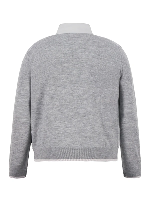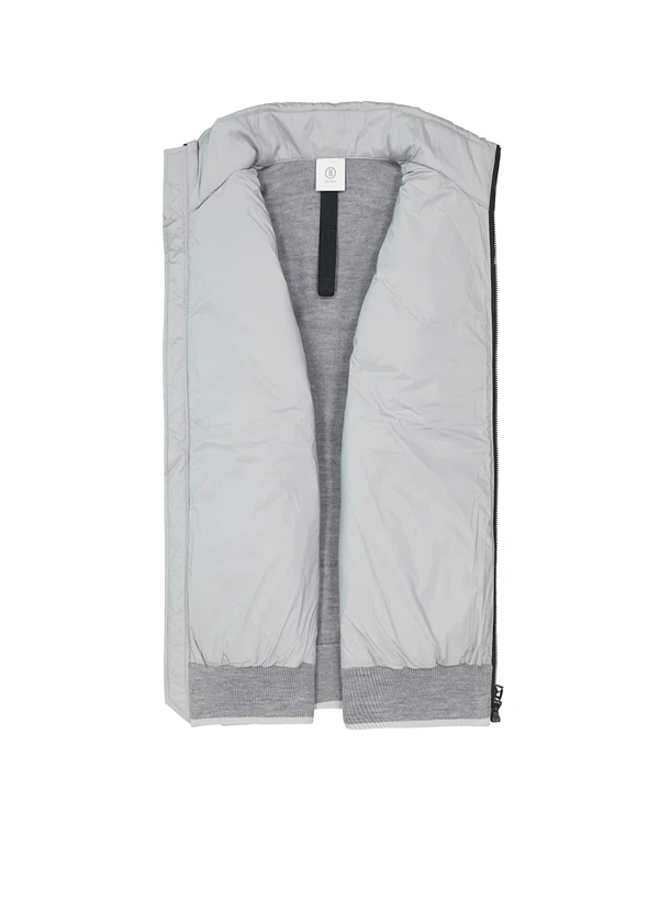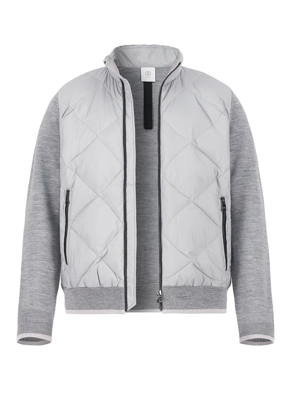 Die graue Hybridjacke kombiniert ein daunengestepptes Vorderteil mit elastischen Strickärmeln für maximale Bewegungsfreiheit. Das recycelte Mikrofaser-Material der Front bietet hervorragende Wärmeisolierung, während die reine Wolle an Ärmeln und Rücken atmungsaktiv bleibt. Der Zwei-Wege-Reißverschluss und die seitlichen Zipper-Taschen machen sie zum vielseitigen Begleiter für urbane Herbsttage. Der Stehkragen schützt zusätzlich vor kühlem Wind.