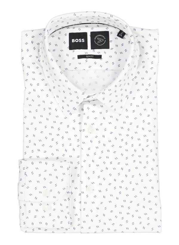BOSS Black zeigt hier seine Stärke in der Verbindung von klassischer Hemdenschneiderei mit innovativen Materialien – deutsche Präzision trifft auf zeitgemäßen Komfort.