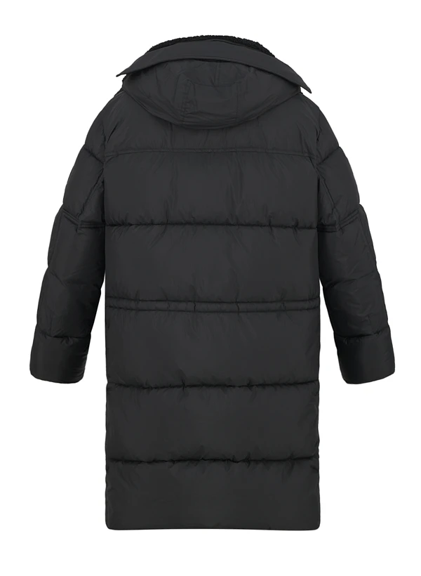 Der schwarze Steppmantel fällt durch seinen kontrastierenden Teddyfell-Kragen auf, der sich bei Bedarf komplett abzippen lässt. Das wasserresistente Polyamid-Gewebe schützt zuverlässig vor Wind und Nässe, während die wärmende Wattierung für behagliche Isolation sorgt. Mit seiner verlängerten Silhouette und den vielseitigen Taschen – von Handwärmern auf Brusthöhe bis zu geknöpften Pattentaschen – vereint er urbane Funktionalität mit lässigem Komfort. Die angeschnittene Kapuze mit Stirnschild und die regulierbare Taille ermöglichen individuelle Anpassungen an Wetter und Stil.