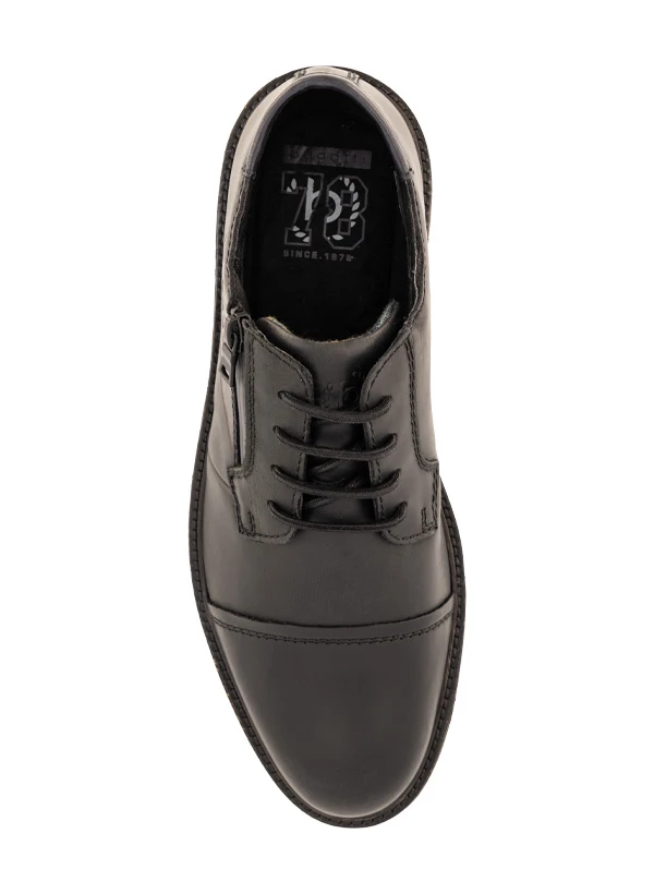 Der bewusst unregelmäßige Vintage-Charakter des schwarzen Leders macht jeden Schuh zum Unikat mit eigenem Charakter. Das weiche Textilfutter schmiegt sich angenehm an den Fuß, während die robuste Gummisohle im Vintage-Look für sicheren Halt sorgt. Die Kombination aus klassischer Schnürung und wasserdichtem Seitenzipper vereint urbanen Stil mit durchdachter Funktionalität. Die geschnittene Kante an der Zehenkappe unterstreicht den handwerklichen Anspruch.