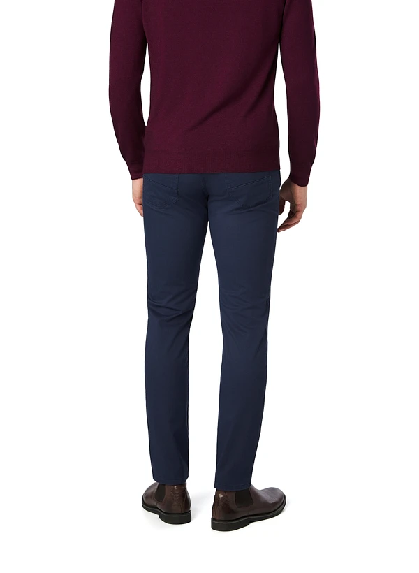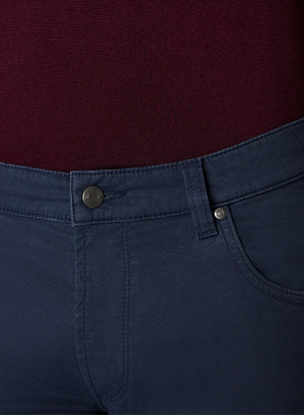Die blau melierte Oberfläche erhält durch die spezielle Peach-Veredelung eine samtweiche, fast pfirsichähnliche Haptik. Der hochelastische Baumwoll-Stretch mit T400-Faser sorgt für dauerhaften Formerhalt und passt sich jeder Bewegung an – ideal für lange Tage im Büro oder unterwegs. Im klassischen Five-Pocket-Stil geschnitten, verbindet diese Hose urbane Lässigkeit mit gepflegter Optik. Die Fußweite von 34 cm bei Größe 34/32 schafft eine moderne, schlanke Silhouette ohne einzuengen.