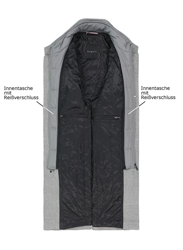 Das markante Fischgratmuster in edlem Grau verleiht diesem Wollmantel zeitlose Eleganz mit dezentem Understatement. Die hochwertige Woll-Polyester-Mischung bietet angenehme Wärme und bleibt dabei atmungsaktiv – ideal für wechselhafte Temperaturen. Der heraustrennbare Steppeinsatz macht den Mantel zum vielseitigen Begleiter: mit Einsatz für kalte Tage, ohne für mildere Übergangszeiten. Die klassischen Leistentaschen und der moderne Stehkragen unterstreichen die klare Linienführung.