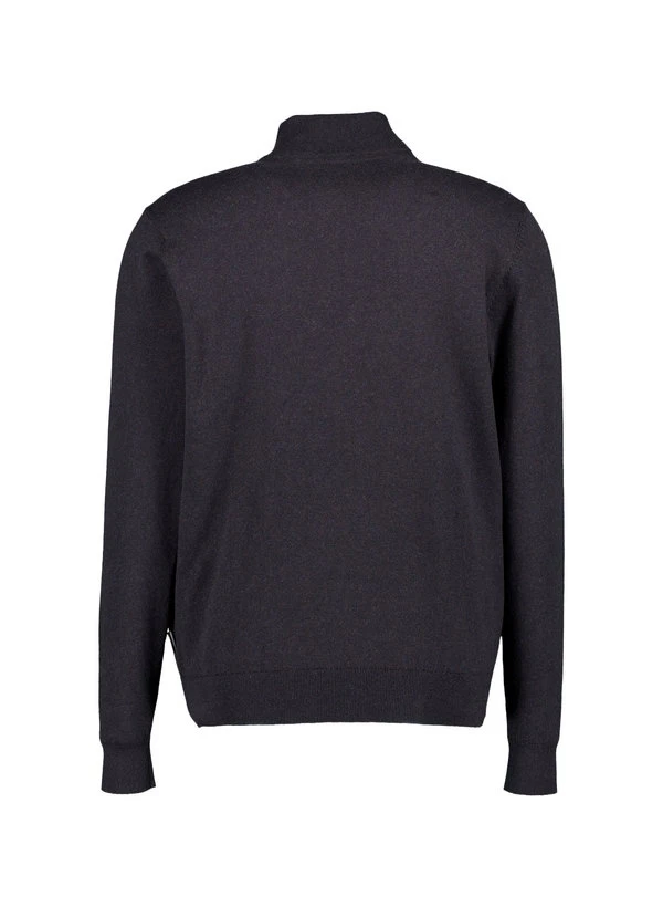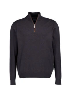 Der anthrazitfarbene Troyer zeigt sich mit einem markanten Stehkragen und feinen Kontrastpaspeln entlang des Zippers. Das hochwertige Baumwoll-Kaschmir-Gemisch fühlt sich besonders weich an und reguliert die Körpertemperatur optimal. Der Feinstrick verleiht dem Pullover eine elegante Struktur, die sowohl im Business-Casual als auch in der gehobenen Freizeit überzeugt. Die durchdachte Passform mit einer Rückenlänge von 69 cm bei Größe M sitzt körpernah ohne einzuengen.