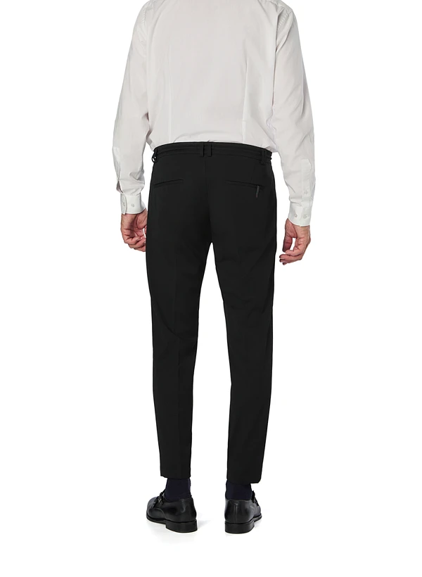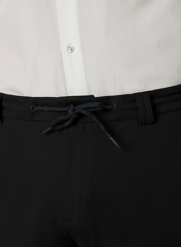 Die tiefschwarze Färbung und die verkürzte Beinlänge verleihen dieser Hose eine moderne, urbane Ausstrahlung. Das weiche Jersey-Material mit recyceltem Polyester-Anteil schmiegt sich angenehm an und bietet durch den Elasthan-Anteil optimale Bewegungsfreiheit für den ganzen Tag. Die Bügelfalte und der variable Tunnelzug vereinen lässige Eleganz mit smartem Business-Look. Seitliche Einschubtaschen und Gesäßtaschen runden die durchdachte Ausstattung ab.