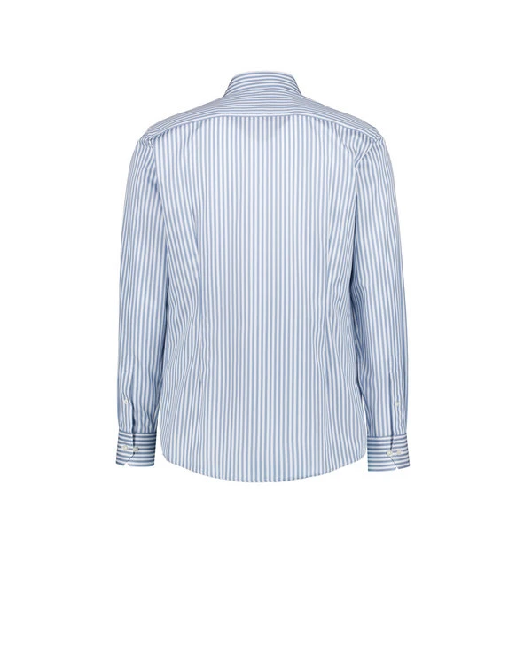 Die klassischen blau-weißen Streifen auf feinstem Twill-Gewebe verleihen diesem Hemd zeitlose Eleganz mit dezenter Struktur. Die reine Bio-Baumwolle fühlt sich kühl und atmungsaktiv an – dabei bleibt das Material dank spezieller Verarbeitung bügelleicht und knitterarm. Der schlanke Slim Fit mit Haikragen wirkt modern und aufgeräumt, ideal für Business-Termine oder gehobene Freizeitanlässe. Die hochwertigen Perlmutt-Knöpfe aus pulverisiertem Material brechen nicht und verleihen dem Hemd einen edlen Schimmer.