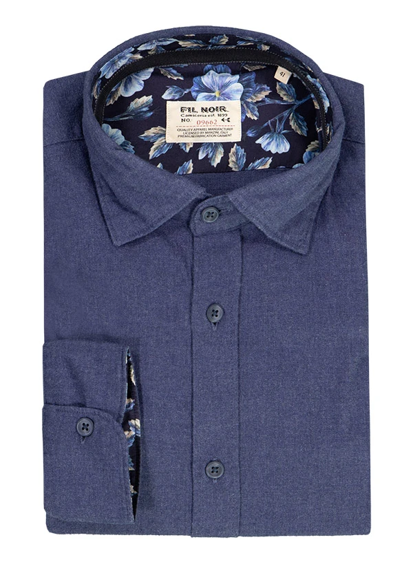 Das indigoblaue Flanellhemd zeigt sich mit einem markanten Button-Under-Kragen, der durch versteckte Knöpfe für einen cleanen Look sorgt. Die aufgeraute Baumwollstruktur fühlt sich wunderbar weich an und wärmt dezent, ohne aufzutragen. Der Shaped Fit betont eine moderne Silhouette, während die französische Knopfleiste und Kontrastdetails am Kragensteg stilvolle Akzente setzen. Die Sportmanschette unterstreicht den legeren Charakter für entspannte Business-Casual-Anlässe.
