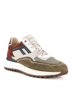 Die Kombination aus samtigem grünem Veloursleder und bordeauxroten Textileinsätzen macht diesen Sneaker zu einem charakterstarken Begleiter. Das weiche Lederfutter und die gepolsterten Schaftränder sorgen für angenehmen Tragekomfort, während die wechselbare Decksohle sich individuell anpassen lässt. Die markante Noppensohle verleiht dem urbanen Design eine robuste Note und sicheren Grip auf verschiedenen Untergründen. Die geschlossene Schnürung und die durchdachten Details unterstreichen die handwerkliche Präzision.