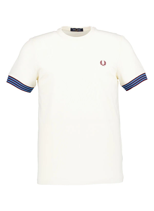 Die cremefarbene Basis erhält durch gestreifte Rippenstrickbündchen an den Ärmeln einen dezenten Kontrast. Das hochwertige Baumwoll-Piqué fühlt sich griffig an und sorgt für optimale Luftzirkulation bei wärmeren Temperaturen. Mit seinem cleanen Rundhalsausschnitt und der körpernahen Passform wirkt das Shirt sportlich-elegant. Das verstärkende Band im Nackenbereich erhöht die Formstabilität und verhindert unangenehmes Scheuern.