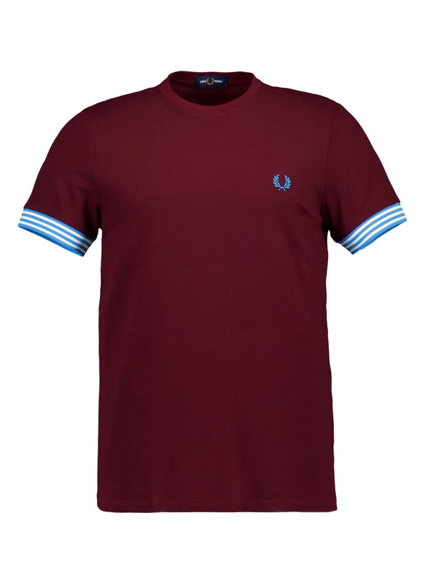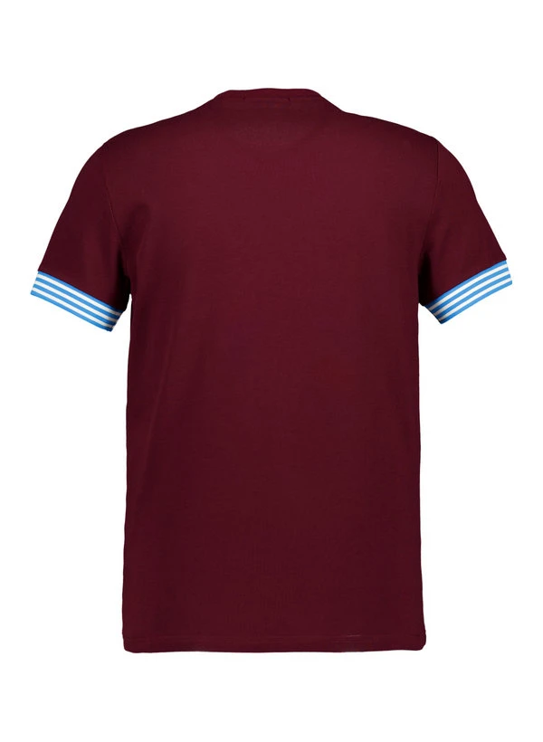 Die gestreiften Rippenstrickbündchen an den Ärmeln setzen markante Kontraste zum weinroten Piqué-Gewebe. Das strukturierte Baumwollpiqué fühlt sich griffig an, transportiert Feuchtigkeit nach außen und behält auch nach häufigem Tragen seine Form. Mit klassischem Rundhalsausschnitt und verstärkendem Nackenband sitzt das Shirt bequem für Alltag und Freizeit. Die Rückenlänge von 72 cm bei Größe M sorgt für eine moderne, nicht zu lange Passform.