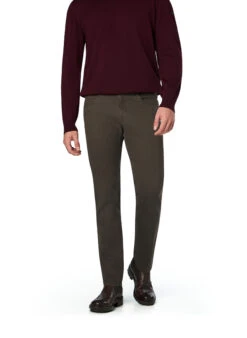 Die braunfarbene Melange-Optik zeigt sich hier in einer raffinierten Twotone-Webung, die der Hose Tiefe und Lebendigkeit verleiht. Der gewaschene Baumwoll-Stretch schmiegt sich weich an die Haut und bietet durch den Elasthan-Anteil optimale Bewegungsfreiheit im Alltag. Als vielseitiger Begleiter funktioniert die Five-Pocket sowohl zum Hemd im Büro als auch zur Strickjacke am Wochenende. Die moderne Passform mit schmal zulaufendem Bein unterstreicht eine zeitgemäße Silhouette.