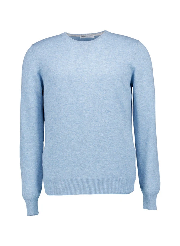 Die hellblaue Farbe verleiht diesem Rundhals-Pullover zeitlose Eleganz und vielseitige Kombinationsmöglichkeiten. Das feine Schurwollgarn mit Kaschmir-Anteil fühlt sich weich an, reguliert die Temperatur optimal und behält dauerhaft seine Form. Der gerade Schnitt mit geminderten Armausschnitten sitzt entspannt und macht den Pullover zum idealen Begleiter für Business-Casual-Looks oder entspannte Wochenenden. Hochwertige Rippenstrickbündchen an Ausschnitt, Ärmeln und Saum unterstreichen die sorgfältige Verarbeitung.