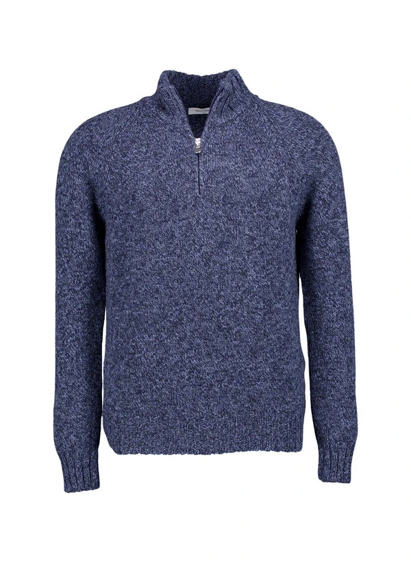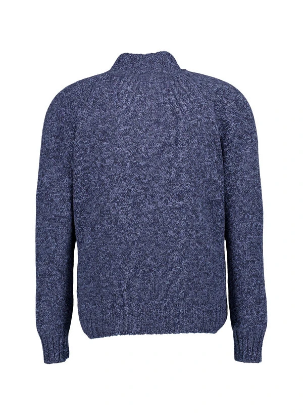 Die markante Strickstruktur in blauem Mélange verleiht diesem Troyer eine charaktervolle Vintage-Optik mit zeitgemäßer Eleganz. Die reine Schurwolle wärmt zuverlässig, reguliert die Temperatur optimal und fühlt sich dabei angenehm weich auf der Haut an. Mit seinem Stehkragen und dem praktischen Reißverschluss vereint er klassische Troyer-Tradition mit modernem Tragekomfort für Business-Casual und gehobene Freizeitlooks. Die hochwertige Verarbeitung zeigt sich in jedem Detail – von der präzisen Strickstruktur bis zu den sauberen Raglanärmeln.