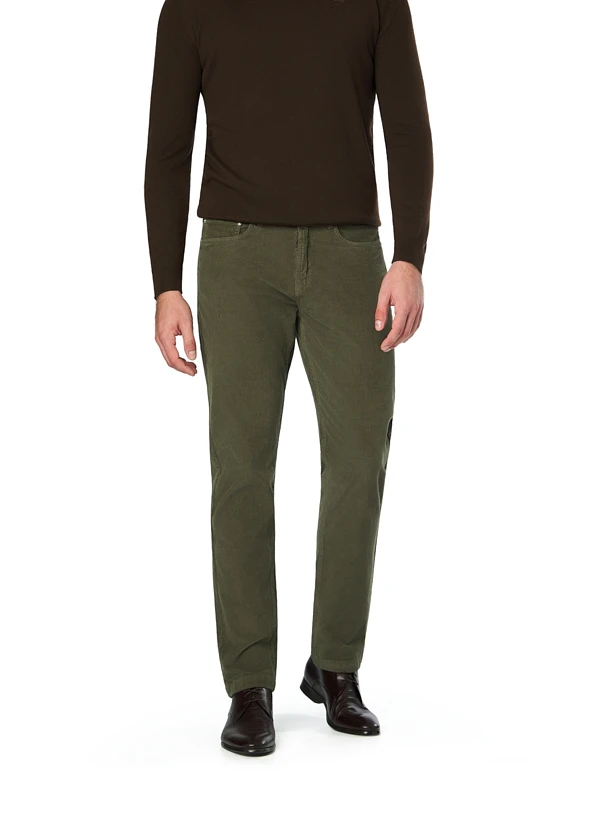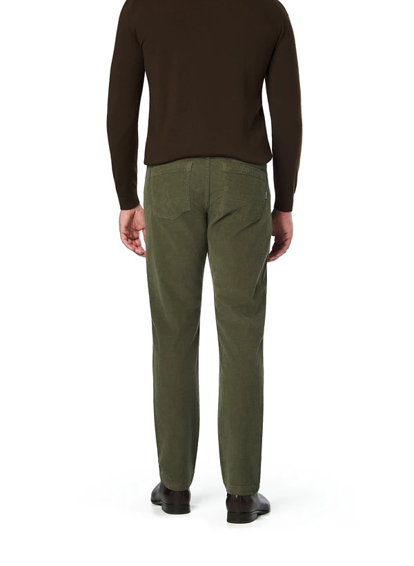 Das satte Dunkelgrün dieser Feincord-Hose verleiht klassischen Five-Pocket-Styles eine zeitgemäße Note. Der feine Cord fühlt sich geschmeidig an und bietet durch den dezenten Elasthan-Anteil angenehme Bewegungsfreiheit für den ganzen Tag. Mit konisch zulaufendem Beinverlauf sitzt die Hose modern ohne einzuengen – ideal für urbane Herbstlooks oder entspannte Business-Casual-Kombinationen. Die charakteristische Cord-Struktur macht die Hose zu einem vielseitigen Begleiter durch die kühlere Jahreszeit.
