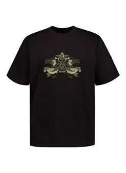 Die markante Stickerei auf der Brust verleiht diesem schwarzen T-Shirt urbane Präsenz mit subtiler Raffinesse. Das reine Baumwoll-Jersey fühlt sich weich an und reguliert die Temperatur natürlich – ideal für lange Tage in der Stadt. Der verstärkte Nackenbereich und die saubere Verarbeitung sorgen für dauerhaften Tragekomfort und Formstabilität. Der klassische Rundhalsausschnitt rahmt das Dekolleté maskulin ein, während die gerade Passform moderne Lässigkeit ausstrahlt.