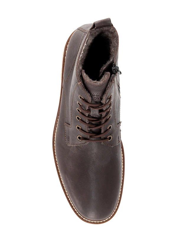 Die markante Rahmennaht und der praktische Reißverschluss an der Innenseite machen diese braunen Boots zum durchdachten Begleiter für kalte Tage. Das weiche Fellimitat-Futter hält die Füße angenehm warm, während das geschmeidige Leder sich perfekt an den Fuß anpasst. Die robuste Gummisohle in Kepp-Optik verleiht dem Schuh urbane Lässigkeit und sicheren Halt auf winterlichen Straßen. Die Zuglasche am hinteren Schaftrand erleichtert das An- und Ausziehen deutlich.