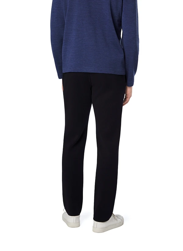 Die markante Rippenstruktur verleiht dieser navyblauen Strickhose eine moderne Textur mit dezentem Tiefeneffekt. Das hochwertige Merinogarn fühlt sich weich an, reguliert die Temperatur natürlich und behält auch bei häufigem Tragen seine Form. Mit weitenregulierbarer Kordel und seitlichen Einschubtaschen verbindet sie lässigen Komfort mit urbaner Eleganz. Die schmale Fußweite von 37 cm sorgt für eine zeitgemäße, schlanke Silhouette.