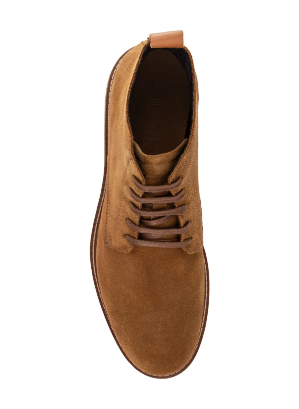 Das cognacfarbene Veloursleder verleiht diesen Desert Boots eine warme, natürliche Ausstrahlung mit dezenter Eleganz. Die samtig-weiche Oberfläche fühlt sich angenehm an und entwickelt mit der Zeit eine individuelle Patina, während das textile Futter für atmungsaktiven Komfort sorgt. Mit ihrer markanten Krepp-Optik-Sohle und dem breiten Rahmen verbinden sie klassische Handwerkskunst mit zeitgemäßer Lässigkeit. Die praktische Zuglasche am hinteren Schaftrand erleichtert das An- und Ausziehen im Alltag.
