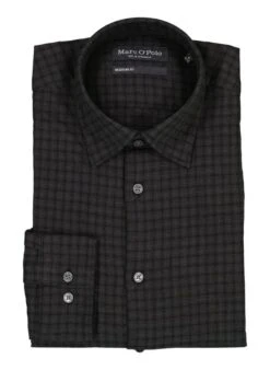 Das dezente Karomuster in Schwarz verleiht diesem Hemd eine zurückhaltende Eleganz, die vielseitig kombinierbar bleibt. Die Bio-Baumwolle fühlt sich weich an und bietet durch ihre natürlichen Eigenschaften ein angenehmes Tragegefühl bei optimaler Atmungsaktivität. Mit seinem Regular Fit und dem klassischen Kentkragen passt es sowohl ins Büro als auch zu entspannten Freizeitanlässen. Die italienische Knopfleiste und die weitenverstellbaren Sportmanschetten unterstreichen die durchdachte Verarbeitung.