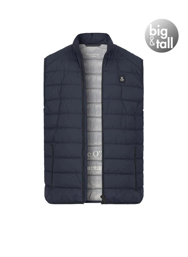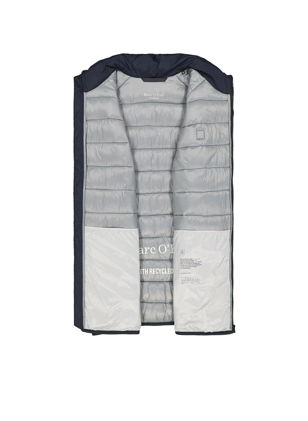 Die dunkelblaue Steppweste zeigt sich mit markanten wasserfesten Reißverschlüssen in Kontrastfarbe an Front und Seitentaschen. Das recycelte Polyester-Obermaterial bietet windabweisenden Schutz bei minimalem Gewicht und trocknet nach Regenschauern schnell wieder. Der cleane Look mit Stehkragen macht die Weste zum vielseitigen Begleiter für urbane Herbsttage. Elastische Einfassungen an Armausschnitten und Saum sorgen für optimalen Sitz ohne einzuengen.