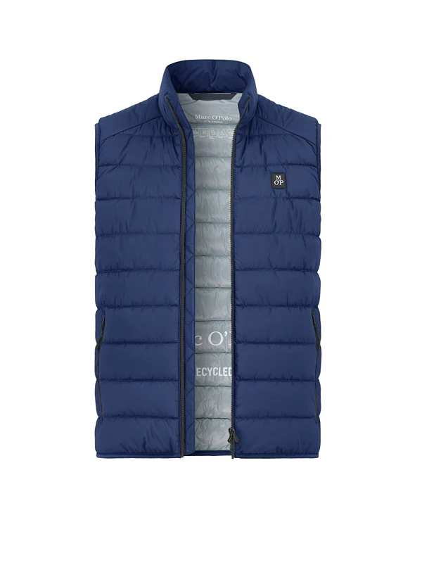 Die dunkelblaue Steppweste zeigt sich in einer matten Mikrofaser-Optik, die durch elastisch eingefasste Kanten einen sportiven Akzent erhält. Das recycelte Polyester-Obermaterial ist wasserabweisend und die innovative Repreve-Wattierung aus recyceltem Plastik sorgt für angenehme Wärme ohne Gewicht. Der Zwei-Wege-Reißverschluss mit Stehkragen macht die Weste flexibel für wechselhaftes Übergangswetter. Seitliche Reißverschlusstaschen und ein elastischer Saumabschluss runden die durchdachte Funktionalität ab.