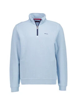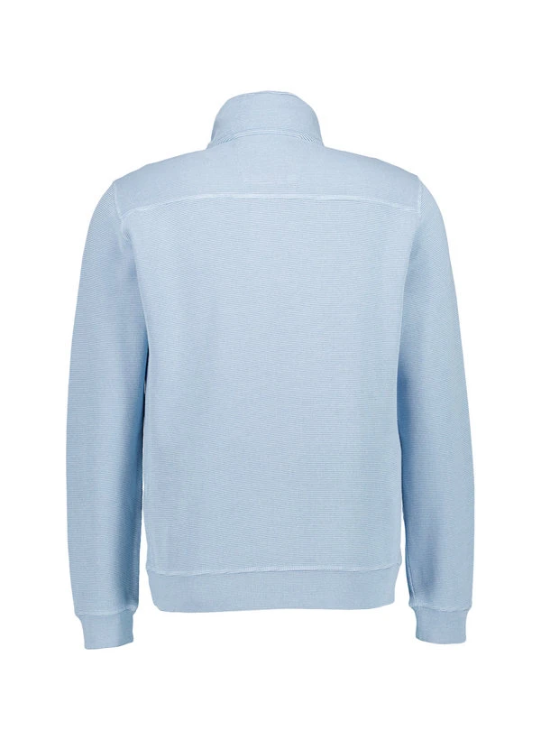 Der hellblaue Baumwoll-Troyer zeigt sich mit einem markanten Zipper in Kontrastfarbe, der dem klassischen Stehkragen eine moderne Note verleiht. Die hochwertige Baumwoll-Melange fühlt sich angenehm weich an und bietet durch ihren Polyester-Anteil optimale Formstabilität für den täglichen Einsatz. Mit seinem cleanen Design und den Rippenbündchen an Ärmeln und Saum passt er sowohl zum entspannten Wochenend-Look als auch ins urbane Alltagsoutfit. Die lebendige Struktur des Materials sorgt für eine interessante Optik, die dem Troyer Tiefe und Charakter verleiht.