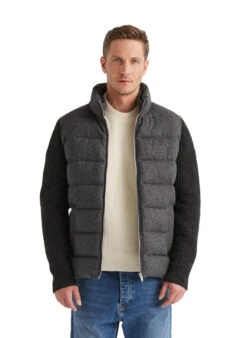 Die dunkelgrüne Oberfläche zeigt eine feine Steppstruktur, die der Weste technische Eleganz verleiht. Das winddichte Nylon fühlt sich glatt und leicht an, während die Polyester-Wattierung für angenehme Wärme ohne Gewicht sorgt. Der wasserdichte Zwei-Wege-Reißverschluss und die elastischen Einfassungen machen die Weste zum flexiblen Begleiter für wechselhafte Tage. Seitliche Reißverschlusstaschen und der schützende Stehkragen mit Kinnschutz runden die durchdachte Ausstattung ab.