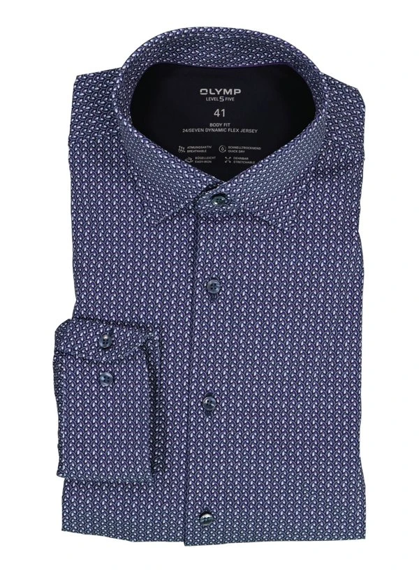 Das marineblaue Mikroprint-Muster verleiht diesem Jersey-Hemd eine dezente Textur, die sowohl im Büro als auch in der Freizeit überzeugt. Der elastische Jersey-Mix aus 92% Baumwolle und 8% Elasthan fühlt sich weich an und bietet durch seine atmungsaktive Struktur ein angenehm trockenes Tragegefühl – ideal für lange Arbeitstage. Die schnelltrocknenden Eigenschaften und die bügelleichte Verarbeitung machen es zum perfekten Begleiter für Geschäftsreisen und einen aktiven Alltag. Der italienische Kentkragen und die sportliche Manschette mit Weitenverstellung unterstreichen den modernen Business-Casual-Charakter. OLYMP verbindet seit 1951 schwäbische Präzision mit innovativen Trageeigenschaften – die 24/Seven-Serie steht dabei für Hemden, die rund um die Uhr funktionieren.