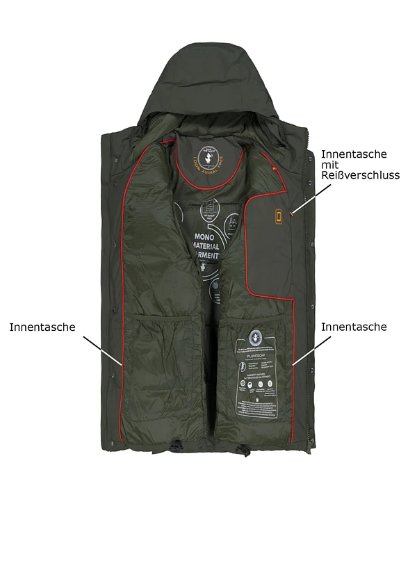 , Mit Zwei-Wege-Reißverschluss, darüber verdeckte Druckknopfblende, angeschnittene Kapuze, Brusttaschen mit wasserdichtem Zip, seitlich 2-in1-Taschen mit verdeckt geknöpfter Patte, Ärmeltasche rechts mit wasserdichten Zip
