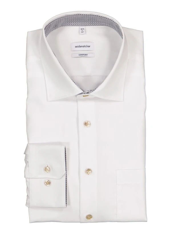 Das klassische Weiß wirkt frisch und klar, während die Kontrastmaterialien an Kragensteg und Manschetteninnenseite dezente Akzente setzen. Die reine Baumwolle fühlt sich angenehm kühl an und bleibt dank bügelfreier Ausrüstung den ganzen Tag über glatt – ideal für Vielreisende und alle, die morgens Zeit sparen möchten. Der Comfort Fit bietet entspannte Bewegungsfreiheit für Business und Freizeit gleichermaßen. Die italienische Knopfleiste mit Kentkragen und die weitenverstellbare Sportmanschette unterstreichen die durchdachte Verarbeitung.