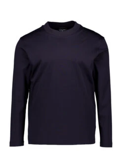 Die breite, halsnahe Blende verleiht diesem dunkelblauen Longsleeve eine moderne Silhouette mit dezentem Statement-Charakter. Mercerisierte Baumwolle sorgt für seidigen Glanz und eine besonders glatte Oberfläche, die sich kühl und geschmeidig anfühlt. Das vielseitige Design funktioniert solo als elegantes Basic oder unter Sakko und Strickjacke für smarte Business-Casual-Looks. Die satte Dunkelblau-Nuance wirkt zeitlos maskulin und lässt sich mühelos mit Grau-, Beige- und Brauntönen kombinieren.