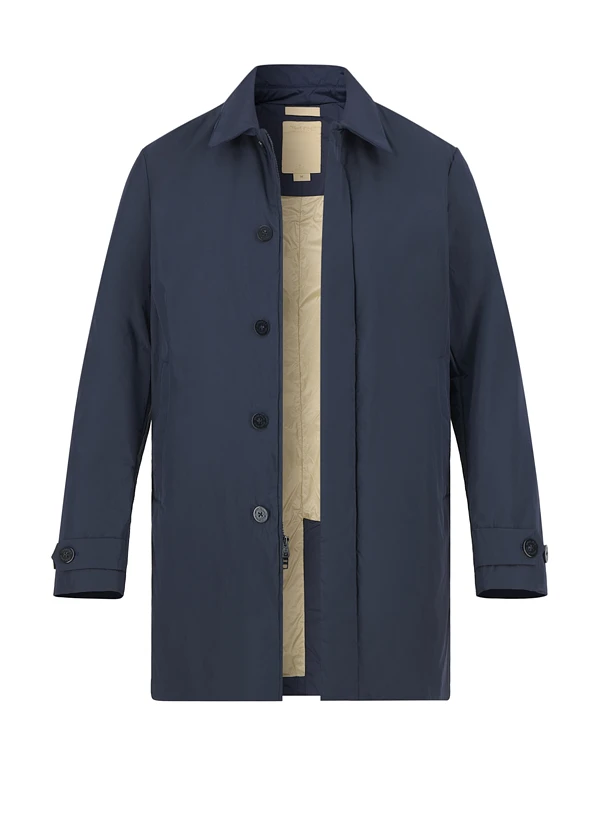 Mit Umlegekragen, Zwei-Wege-Reißverschluss, darüber verdeckte Knopfleiste, verdeckt geknöpfte Seitentaschen, Ärmelsaum mit Weitenregulierung, Rücken mit Mittelschlitz